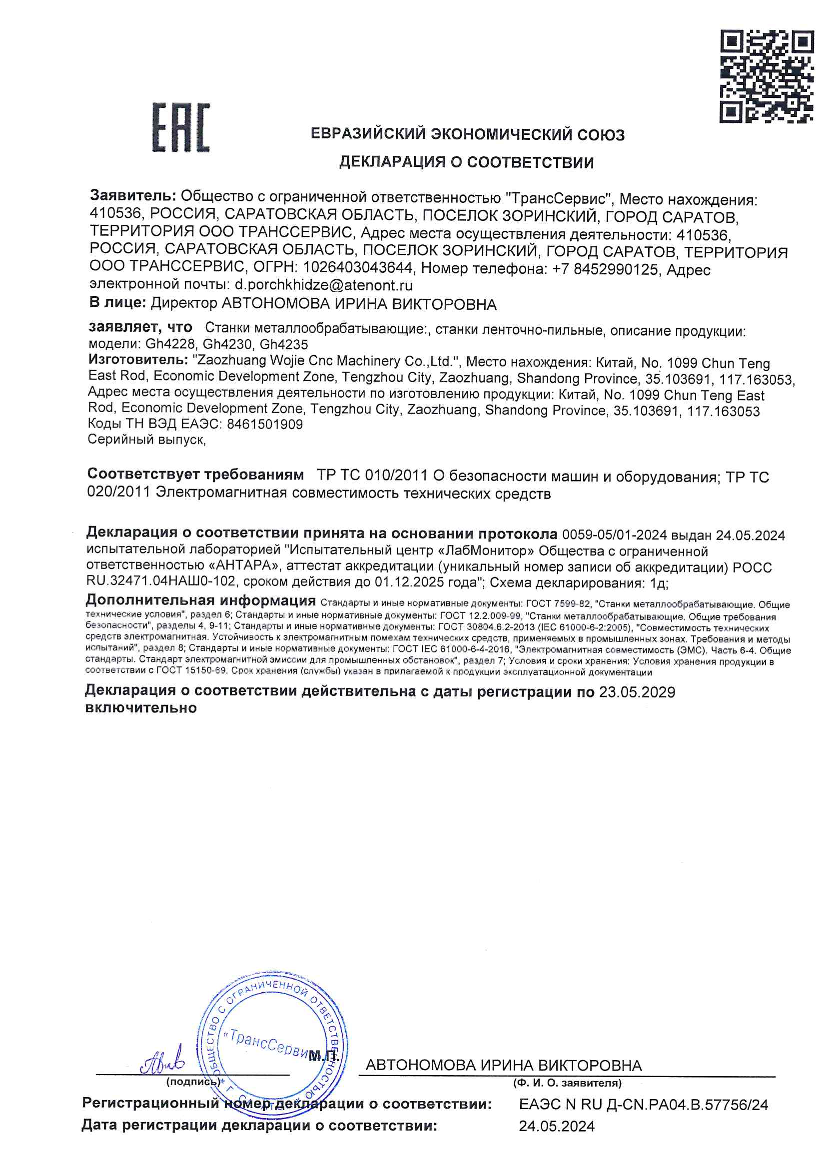 | Оборудование для производства Test Report | При условии |